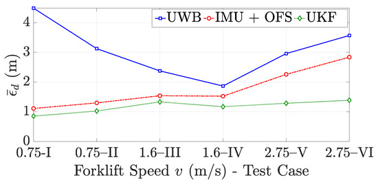 As expected, the forklift speed might impact the UKF performance. Therefore an error analysis with varying forklift speed was conducted also via experimental tests. By considering test case trajectories I-VI, the forklift speed assumes the values 0.75 m/s (test case I and test case II), 1.6 m/s (test case III and test case IV), and 2.75 m/s (test case V and test case VI), and the path length is around 100 m. Figure 14 shows the mean distance error when the forklift speed varies. Different from the analysis conducted with the numerical simulations (Figure 7), the error given by the UWB system varies with the speed, but it decreases until the forklift speed reaches 1.6 m/s (IV) and then rises again. This effect could be explained by considering that for low speeds the forklift spends more time by doing maneuvers and curves, in which the UWB system does not perform well. When the forklift travels fast, instead, as in test cases V and VI, the UWB system performs worse. The onboard kinematic sensors, however, perform better for low-speed trajectories, and their error increases with the forklift speed. Hence, by looking at Figure 14, it can be concluded that low forklift speeds are preferred by the proposed system, which is able anyway to reduce the localization error to values always lower than those guaranteed by the UWB system only, or by the kinematic sensors (IMU + OFS). The minimum obtained error with the UKF is around 1 m in for the test cases I and II.