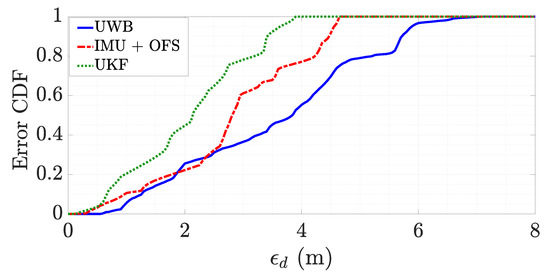 Cumulative distribution function of the distance error for test cases with similar trajectories as the one represented in Figure 3.
