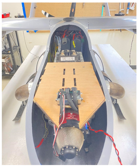 The class of turbines at the bottom of the scale is meant for miniature unmanned aerial systems (UAS). These turbines are called ultra-micro gas turbines and typically produce less than 1 kW of power. These proposed turbines can weigh less than 500 g and allow for an entirely new class of UAS to be realized [10,11]. However, significant engineering challenges have prevented any ultra-micro gas turbine from achieving its design point output power. This article focuses on a 7.3 kW shaft-power-rated turboprop engine. This turboelectric system is intended to act as the powerplant for UAS and can be seen installed within an unmanned aircraft in Figure 1.