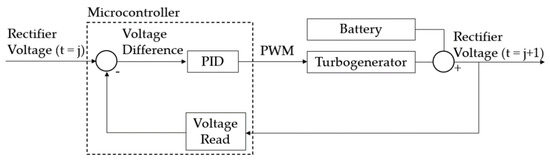 A PID controller was used to control the throttle inputs to the turbine. In this operating mode, the main goal of the turbine is to maintain a constant supply voltage to the electrical load. The voltage supplied by the turbogenerator varies as the demanded load is changed (this can be seen later in this paper). The voltage supplied to the load (i.e., the rectifier voltage) is used as a feedback variable for the PID. The rectifier voltage directly depends on the voltage from the turbogenerator, with discrepancies due to the current traveling through the rectifier and the rectifier’s temperature. As the temperature of the device increases, its internal resistance and subsequent voltage drop through the device increases directly with it, shown in Equation (2). This increase in resistance supplies a more significant discrepancy between the turbogenerator voltage and the rectifier bus voltage shown in Equation (3). However, with proper current and temperature monitoring, this change in rectifier forward voltage, , can be estimated and accounted for in real-time or in post-processing.