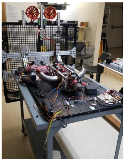 Electric motors pose a danger risk more severe than that of piston engines, as stated in [20]: “Model aircraft electric motors can be more dangerous than gas engines of the same power class because the propeller does not slow down readily when a body part is hit; rather, the motor just pulls more current from the battery (source) as it attempts to retain the RPM”. The 20 kW motor and corresponding propeller were housed within a wire-mesh assembly to ensure foreign objects could not impact the blades to help prevent injury during testing. The ground test stand provides a portable testbed that can be utilized for differing ranges of turboelectric systems, with a maximum overall power loading capability of 23 to 28 kW. A photo of this system can be seen in Figure 4.