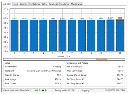 A battery augmentation system was developed to aid with the performance of the turbine and system response time. A battery package can add power in conjunction with the turbogenerator output and respond to desired power inputs more quickly than the turbine is physically able to. A battery management system (BMS) was used to monitor the voltages of the individual cells of the batteries. The battery’s charge capacity, instantaneous charge/discharge rates, and voltages for each battery cell were tracked by the BMS to ensure the battery system would not be damaged. The individual cell voltage tolerances for Li-Po batteries are 3.7 V ± 0.5 V. This restriction means that the minimum recommended voltage for an individual Li-Po battery cell is 3.2 V volts. In comparison, its maximum is 4.2 V, and its nominal voltage is 3.7 V. The BMS ensured that these voltage constraints were maintained for each cell rather than solely monitoring the combined battery assembly. A data screen from the BMS can be seen in Figure 6.
