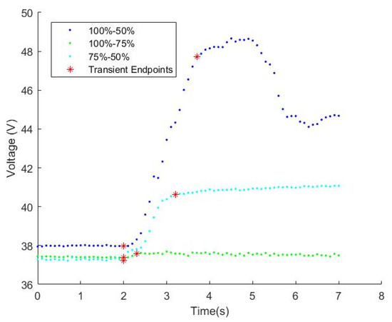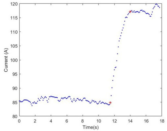 This method was used instead of one which checks for consecutively rising points because there was a possibility that some data sets involved an extremely rapid change within a few points. There was also the possibility of consecutively rising points not part of the transient test, as seen at approximately the 16 s mark in Figure 7. An algorithm based on the absolute magnitude of change at the beginning and end of the throttle transient could not be used because the magnitude of change varied between throttle tests (e.g., the 50–100% transient would have a more considerable shift in current than the 50–75%). The method used is advantageous as it automatically scales to the magnitude of change in current and avoids many potential false transient points.
