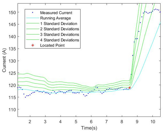 A plot showing measured currents, a running average, and positive multiples of the standard deviation.