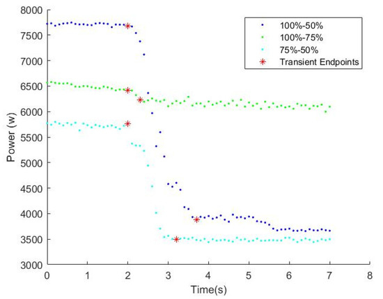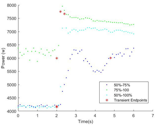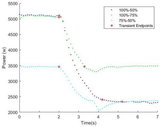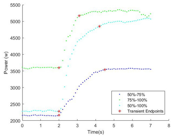 The program generated plots for throttle transients and compared them along shared axes using the algorithm described above (Figure 9). While current was used to determine the start and endpoints of the transient period, the power provided is a more pertinent parameter to compare different throttle steps. Initial observations show that the 50–100% test took nearly as long as the 50–75% test point to complete. The 50–100% test did not reach maximum power as soon as the 75–100% test.