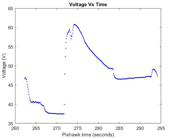 The 12S Li-Po battery ensemble used during testing did not register voltages outside of its safe operating conditions while conducting the experiments (Figure 17). However, the circuitry, wiring, and generator experienced temporary, sudden increases in voltage up to 60 V during the 100–0% throttle experiments, as seen in Figure 15. The power saturation during sudden load shutdowns was protected from the battery by its resistor bank during testing. While the resistors aided the battery in power digestion during these load shutdowns, the resistors did not protect the rest of the system. Experimenting in acceptable increments would help identify more potential system limitations and safety factors without a resistor bank protecting the battery. Further optimization may be possible as a result of said research.