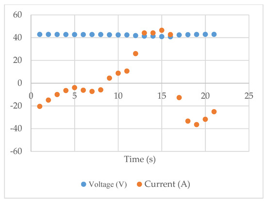 Battery pack voltage and current during the 100% throttle load cutoff test. The battery pack voltage successfully switches from discharge (positive) to recharge (negative).