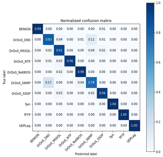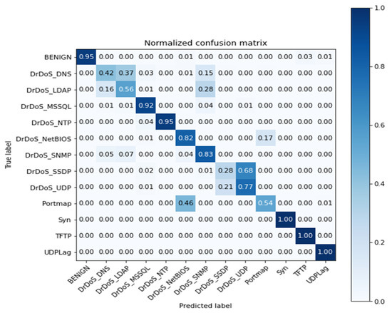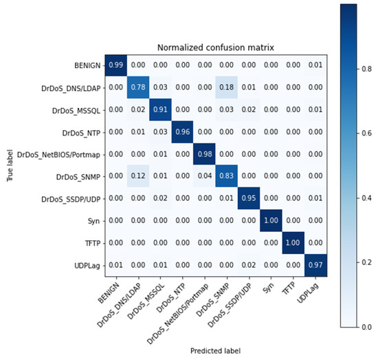 In this scenario, the model exhibits confusion for the DrDoS DNS-DrDoS LDAP labels. This confusion lies in the nature of the attacks and their similarity, as the information captured by the network monitoring instrument is similar. The values reflected in the dataset attributes will also have this similarity, thereby negatively affecting the metrics of the model. The same behavior is observed for the Portmap, UDP, SSDP, and NetBios labels.