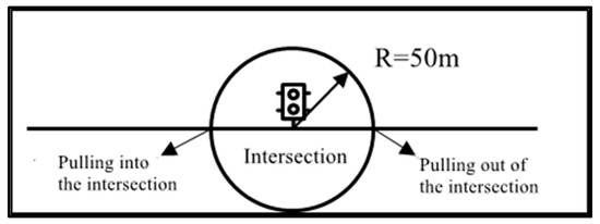 Due to data limitations, only bus vehicle operation data were obtained, and this study was not able to calculate delays in combination with intersection traffic, which was calculated directly from bus operation GPS data. Cross delay refers to the delay time from the time the bus enters the intersection and slows down until the bus leaves the intersection completely [31], as shown in Figure 3, Cross delay diagram.