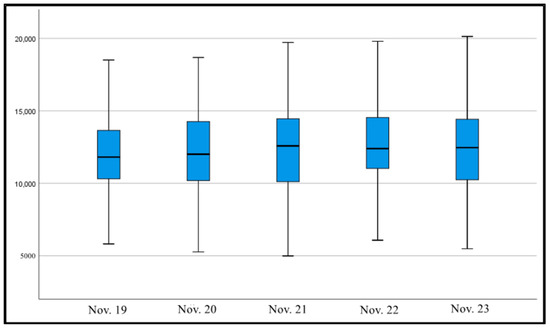 The total delay box line diagram for bus operation under different weather conditions is shown in Figure 5. The box line plot shows that the median, upper quartile, and lower quartile delays do not differ significantly by date. This indicates that weather changes do not have a significant impact on the operation of the 101 bus vehicles.