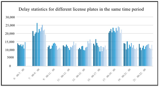 Similarly, the average values of delays of different license plates at the same time period within 5 days are counted, as shown in Figure 6. The average values of delays exhibited by different license plates at the same time period have a uniform pattern, with a significant increase in delay values during peak periods. It shows that driver behavior also has little impact on the health of public transport operations, which is consistent with the conclusions of the correlation analysis.