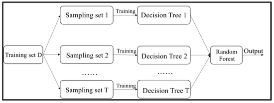 Random Forest is an extended version of Bagging. Figure 9 shows a schematic diagram of the learning process of Random Forest. Random Forest is an integrated machine learning algorithm that uses CART decision trees as individual learners. First, T sample sets are sampled from a training set D containing m samples by a self-service sampling method. Then, each sampled set is learned using a decision tree. Random forest is called an extended version of Bagging, because it builds on the Bagging integration by introducing random feature selection when training decision trees. The traditional decision tree algorithm selects an optimal feature from all the features of the current node when selecting the nodes of the tree for dividing the features. In contrast, decision trees in random forests are constructed by first selecting a random subset of features from all the features of the current node and then selecting an optimal feature from the subset of features. This can further enhance the generalization performance of the integrated learner. Finally, the prediction results for the samples are cast using the simple voting method.