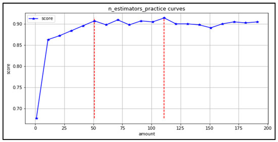 (1) n_estimators: refers to the number of tree models in the random forest, this parameter determines the size of the forest. If the n_estimators value is too small, it is easy to under-fit. However, if the value of n_estimators is too large, the forest is too large, which will increase the training time of the model. Draw the learning curve of n_estimators in the range (0–200). It can be seen from Figure 11 that the results are better in the range (50,120), and the model accuracy does not change much beyond 120. Therefore, the grid search range is (50,120).