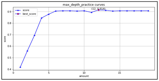 (2) max_depth: the learning curve is plotted in the range (1,20), as shown in Figure 12. The optimal range of maximum depth is (6,20). The highest accuracy is 0.914 when taking 12.