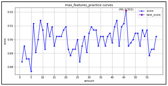 (3) max_features: There are 63 features in this study, thus the learning curve is plotted for the maximum number of features in the range of (1,63). As seen in Figure 13, the best result is achieved with an accuracy of 0.921 when the maximum features are taken as 46. The maximum number of features is searched in the range (6,55) for grid search.