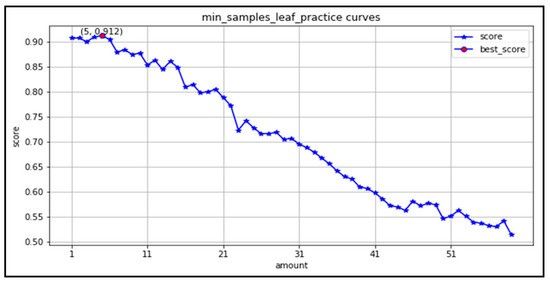 (4) min_samples_leaf: the learning curve is plotted in the range (1,60). As seen in Figure 14, the minimum number of leaves works best in the range (1,5). As the parameter increases, the accuracy decreases.