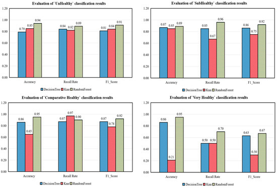 The evaluation metrics of each classification label are shown in Figure 16. Random Forest outperforms the other two algorithms in all health classes. In particular, in the “very healthy” classification level, the random forest algorithm performs much better than the other two algorithms due to the small number of very healthy samples.