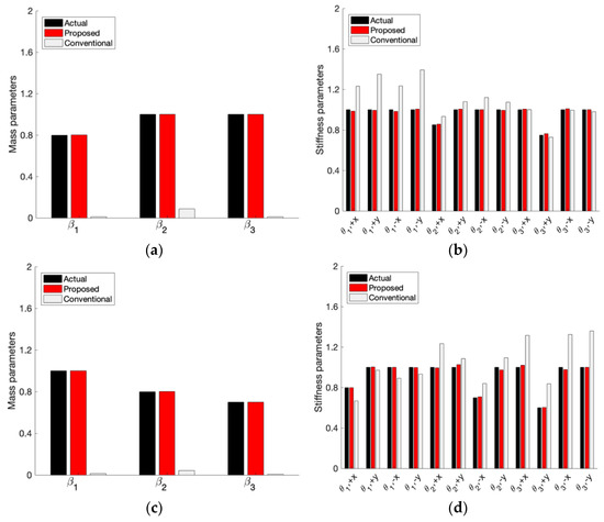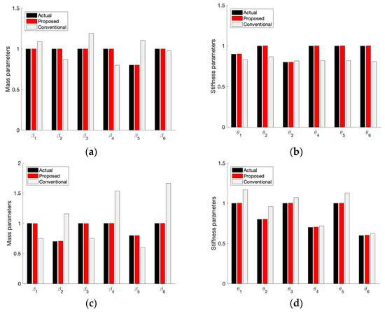 The MPVs of the updated parameters are obtained using the linear optimization method [53]. To be specific, the derivatives of objective functions in Equations (30) and (31) with respect to and are calculated, then are considered as equal to zero. When updating mass, the optimal is obtained by optimizing in Equation (30) with respect to :