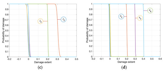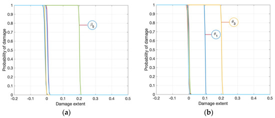 To measure the probability of the variation in mass and stiffness parameters, the MPVs of the updated parameters and associated uncertainty are used together to quantify the damage probability given a specific damage fractional level compared with its healthy condition. Based on asymptotic Gaussian approximation, the probability of damage in the th structural parameter can be given by [53]