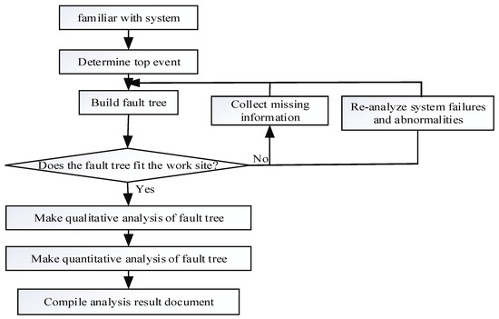 The basic procedure of the FTA method is shown in Figure 1. The first step is to get familiar with the system that needs to be analyzed, by understanding the system status and various parameters, and drawing the process flow chart or floor plan. Second, the information on the accident cases (which occurred in the same industry and on similar devices at home and abroad) is collected, and the accidents that have serious consequences and can easily occur as top events are identified. Based on the experiences, lessons, and accident cases, after the statistical analysis, the probability (frequency) of the accident is calculated, and the target value of the accident to be controlled is determined. Then, the fault tree is constructed from the top event according to the logical relationships among the events. If the constructed fault tree does not conform to the on-site conditions, it is also necessary to collect the missing information, re-analyze system failures and abnormalities, until the established fault tree is in line with the actual on-site conditions. Finally, a qualitative analysis is performed to determine the structural importance of each basic event, the probability is calculated, and a quantitative analysis is performed.