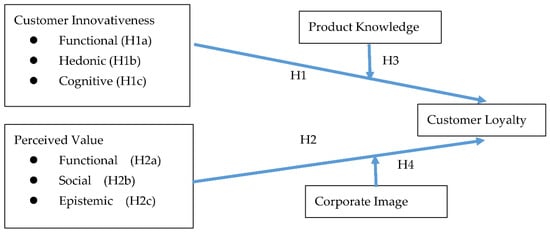 Fredericks and Salter [] proposed that the corporate image is an important element in the value equation: the image can support or undermine the perceived value of customers and further affects their loyalty. As the influence of image requires a comprehensive validation using different dimensions, perceived value in this research will be tested through the aspects of functional, social, and epistemic. According to Kandampully and Hu [], the corporate image functions as a filtering mechanism that determines the evaluation of a product or service, as well as the intention to maintain the overall satisfaction and loyalty to the company. Supported by the previously mentioned studies on the relationships among customer innovativeness, perceived value, customer satisfaction, and customer loyalty, corporate image will be considered as a moderating variable; the related hypothesis is proposed below: