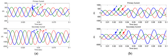 Internal fault simulation’s primary and secondary currents: (a) the scenario of a high-voltage winding malfunction; (b) the scenario of a low-voltage winding malfunction.