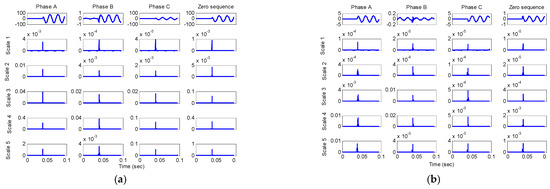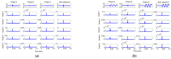 The DWT is applied to the 1/4 cycle of current waveforms after the fault initiation, based on a trial-and-error procedure. To decompose the high-frequency components from the current signals, the Daubechies 4 (db4) mother wavelet [54,55,56,57] is used. The coefficients of the signals obtained from the DWT are squared and studied in each scale. As shown in Figure 6, Figure 7 and Figure 8, when a fault develops, the coefficients of high-frequency components change abruptly compared to those before the fault occurs. This abrupt change is employed as a predictor of fault occurrence.