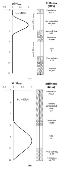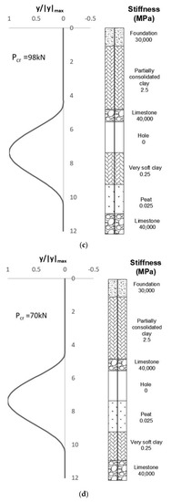 The buckling load of the pile in Figure 6a is mainly affected by the not-embedded part of the pile between the foundation and the first soil layer. The pile also deviates from the straight configuration when the lower cave is passed through, but this deviation is so slight that it can be identified only by calculations, while it is not distinguishable in the plot. Figure 6b shows that when a pile, instead of being embedded in the limestone rock, is only embedded in the soft clay layer at the cave base, its bottom end is free to rotate, thus causing the buckling load to decrease dramatically and become much less than Npl. Figure 6c,d show that if a pile passes through a limestone cave with two layers of soft soil with low but different stiffnesses (peat and very soft clay) sedimented over the bottom of the cave, buckling load is highly affected by the inversion of the sedimentation order of the two soft soils.