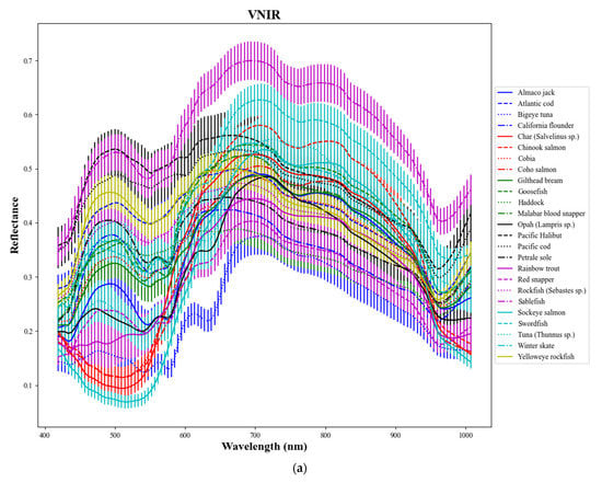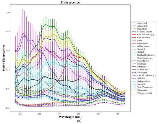 Average spectra for each of the 25 fish species. (a) VNIR reflectance; (b) scaled fluorescence; (c) SWIR reflectance. Error bars correspond to half of a standard deviation over all voxels for each species.