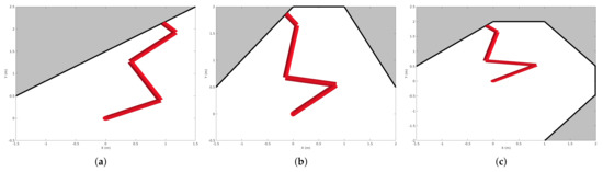 Figure 1. Workspaces for simulation experiments. Experiment I (a), Experiment II (b) and Experiment III (c). The manipulator fixed base is located at the coordinates. The dark grey sections define the obstacle walls, with its surface identifying the contact line to be tracked by the manipulator end effector. - A real 7DoF manipulator: The Sawyer robot, by Rethink Robotics, is composed of seven rotational joints. The manipulator is made to follow a virtual straight path that lies exactly on a surface. Thus, the robot end effector must be capable of visiting a set of positions defined by with that sit on the surface, and do so with an orientation of the end effector perpendicular to the surface. Since the robot has 7DoF, there exists a free degree of freedom. Again, at each time step i, our proposed algorithm will compute the robot’s path , exploiting the null space of the previous task point just visited.