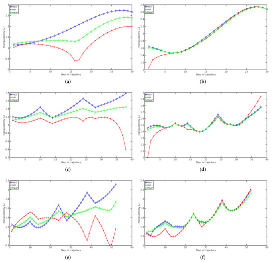 Figure 2 presents the results in terms of manipulability at each time step along the single line environment (case studies I, II and III). For all graphs, the blue line represents the joint trajectory that possesses the higher mean manipulability that the algorithm can achieve. The trajectory with minimum mean manipulability is also shown in red, whilst green presents a trajectory that lies in the mean value of all the manipulabilities obtained. We compare the results of the proposed Stochastic Constrained Optimization (SCO) method on the right (Figure 2b,d,f) with the output of Algorithm 2 on the left (Figure 2a,c,e), representing the path solution recovered from an inverse kinematic solution based on the Moore–Penrose pseudo inverse. The initial position used for this algorithm is selected randomly. It is clearly apparent how SCO is able to consistently produce trajectories that attain a higher degree of manipulability along the trajectory, while, at the same time, accomplishing the task at hand. Please, note also the low dispersion achieved in the manipulabilities represented in Figure 2b,d,f, indicative of the dependable ability of SCO to produce high manipulability regardless.