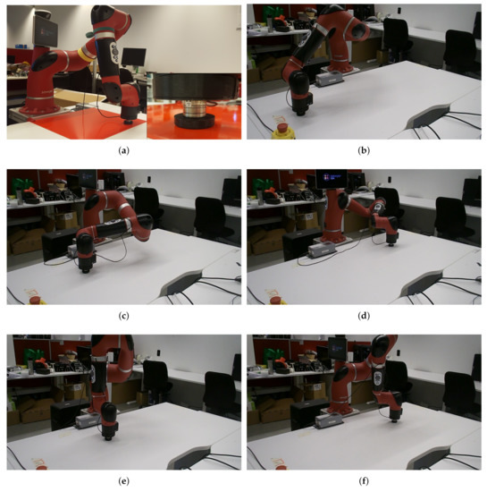 Sawyer polishing task experiment: (a) setup: 7R manipulator with a force sensor attached to the robot end-effector, a tool consisting of a cylinder of 43 × 43 × 10 mm attached to the sensor and a flat surface target, (b) initial pose with minimal manipulability for both tests, (c,d) proposed SCO algorithm, (e,f) “Simple Planner” case.