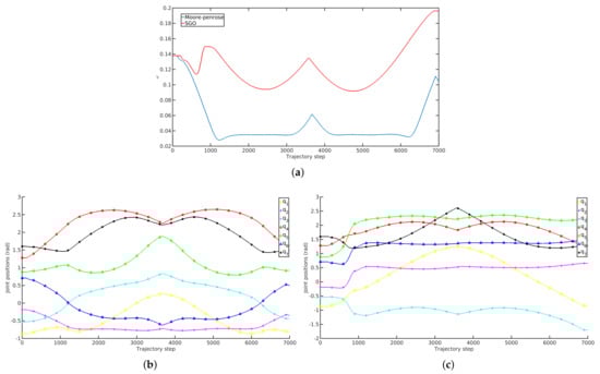 Real polishing experiment with the Sawyer robot: (a) Manipulability comparison: attained manipulability evolution of the traversed path illustrated in Figure 3, with the proposed SCO scheme shown in red (top line), and the “Simple Case” Moore–Penrose solution depicted in blue (bottom line). Corresponding (b) “Simple Planner” trajectory evolution, and (c) Evolution of joint trajectories using the SCO algorithm.
