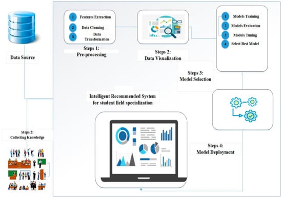 In the current study, we developed an intelligent system for the field of specialization selection. We trained and tested various ML models on a student dataset because such techniques are suitable for categorical data. The proposed framework has the following stages: data preprocessing, visualization model selection modules, and model deployment. Figure 1 shows all the steps of the proposed framework. Overall, this section provides all the implementations of the student study field intelligent system in the form of the below sub-section.