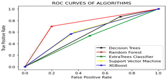 Extra tree classifiers (ETC) are used in the third step to predict the student’s field of specialization. ETC is an ensemble learning technique that collects the result of multiple trees. The approach is similar to an RF classifier, but the tree construction method differs. The accuracy of the ETC classifier on the student dataset is 0.52. During training, the ETC Classifier used the default parameters (n_estimators = 100, random_state = 0) to predict student specialization with high accuracy. The TPR and FPR of the ETC classifier were 0.53 and 0.49, respectively, as shown in Table 5.