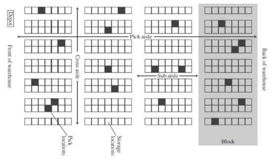 - Berglund, P.; Batta, R. Optimal placement of warehouse cross-aisles in a picker-to-part warehouse with class-based storage. IIE Trans. 2011, 44, 107–120. [Google Scholar] [CrossRef]