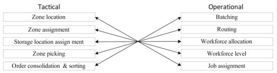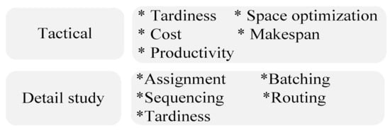 | Assignment | Orders should be retrieved by order pickers within tight time windows. The job assignment planning problem determines the sequence according to which orders or batches of orders should be retrieved, as well as the assignment of these (batches of) orders to a limited number of order pickers [14]. |
