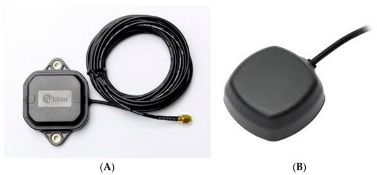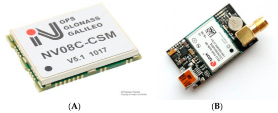 (A) NV08C-CSM low-cost single-frequency receiver; (B) ZED-F9P low-cost dual-frequency receiver.