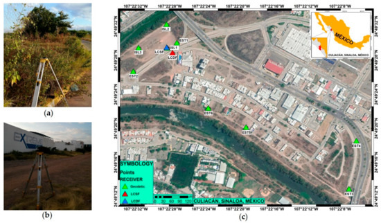 (a,b) Example of 3D location of the low cost GNSS Antenna. (c) Location GNSS stations occupied in the observation campaigns, located in Culiacán Sinaloa, Mexico.