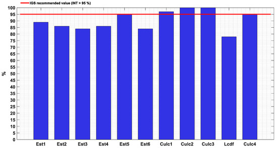 The results of the quality check of the stations considering four parameters (INT, MP, CSR, SNR) are presented in Table 5; however, for the single frequency receivers, it was not possible to analyze the quality of the observations because at least two frequencies are required. The linear combination between carrier phase and pseudo-range observations in L1 and L2 is necessary for the estimation of the root mean square (RMS) [54]. The percentage of the integrity of the stations varied between 78% and 100%, the obtained results could be related to the locations (urban areas). CULC presented the highest quality values, due to being a reference station with open sky. The minimum recommended value for the integrity is 95%, where only CULC1, CULC2 and, CULC3 stations with 97%, 100% and 100%, respectively, exceeded this value. The stations named “CULC1-3” are the same, the assigned number is for proper identification for the static relative process. EST5 and CULC4 stations are within the limit as shown in Figure 5 (where the horizontal red line represents the recommended value). The rest of the stations do not show a good integrity performance, which is related to the surrounding environment. The LCDF station has the lowest integrity with 78%.
