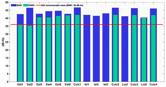 With the signal-to-noise ratio and the multipath effect, a weak SNR would be expected in most stations, since both variables have an inversely proportional behavior [55], however, this only occurs in the stations EST1, EST3, and EST6. The other stations show a directly proportional relationship, where EST1 shows a strong signal in and a weak signal in . Furthermore, other dual-frequency receivers show strong signals on both bands, as well as the single-frequency receivers shown in Figure 7, where the red line shows the limit between strong signals ≥ 36 dBHz and weak signals < 36 dBHz, being a quality check parameter that reflects the signal tracking and capturing performance.