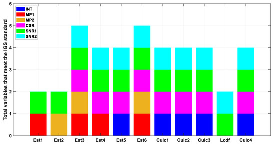 Variables that meet the standards established by the IGS. The values of: MP1 = 1, MP2 = 1, SNR1 = 1; SNR 2 = 1; CSR = 1; INT = 1, are assigned if the variables are accomplished.