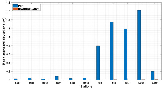 Table 8 shows the standard deviation obtained from the static relative and PPP methods. For the static relative method, the standard deviation is in the order of mm. For the stations where the dual-frequency geodetic receiver was used, the standard deviation is in the order of mm, even in the stations where there are obstructions to the antenna. For the stations where the single frequency geodetic receiver was used, the values are approximately 3 mm. On the other hand, the dual and single frequency low-cost receivers have similar behavior to single-frequency geodetic receivers; however, it is in the vertical component where the most affected values were found (centimeter level). Thus, it could be related to the non-calibration antenna.