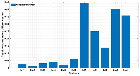 Figure 13 shows the sum of the differences in coordinates (latitude and longitude) in m, where a large difference is found on the single frequency geodetic receiver (ISL1-3) and low-cost receivers (LCSF and LCDF). This may be due to the fact that the antenna of the low-cost GNSS receiver does not have an IGS calibration or circular polarized antenna (irregular gain pattern and low multipath suppression) [56].