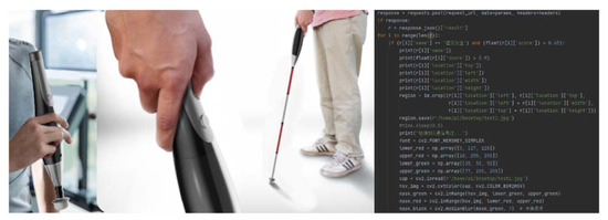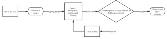 A scenario is as follows. Kang participates in an activity in a community club and is given a multi-scene intelligent cane with account points: More Than a Cane, a product to solve the difficulties of crossing roads and daily information recognition visual impairment. When Kang arrives at the traffic intersection, he turns on the camera to obtain image information. The cane judges the color of traffic lights through an intelligent hardware algorithm, enables sidewalk green light recognition, and feeds back through a vibration sensor. Kang crosses the road smoothly after feeling the vibration and hearing a voice prompt simultaneously. At home, he stows the cane body and sends a drug manual’s text information through the camera of the handle. After text recognition, the cane reads out the content of the drug manual and helps him understand the dose method. The prototype and part of the coding are shown in Figure 1. The form-giving design is adjustable and can be applied to multiple scenes. The specific HCI logic diagrams are shown in Figure 2.