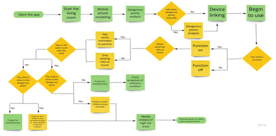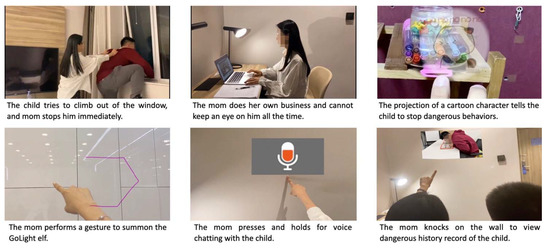 The scenario is as follows (Figure 4): As a working mother, Qin receives an urgent notice from work. She rushes to have a video conference and leaves her four-year-old child, Cong-Cong, playing alone in the living room. After playing with toys for a while, he feels boring and explores around. He finds a pack of colored pens and is excited to have them. The position of the pack is relatively high on a shelf, so he cannot see a pack of pushpins by the colored pens. When his hand approaches at a dangerously close distance, a smart light from the Go-Light detects the potential danger and projects a smart AR elf in front of Cong-Cong to block him. A voice prompts (his mother’s voice) ‘Cong-Cong, don’t touch this, there are pushpins, and they will stab you’. He puts down his hand and goes back to read his picture books. At the same time, the smart light detects that the blocking is successful and sends a short message to the mother’s mobile phone to explain the situation. After the video conference, Qin lets the smart light cast on the wall and reviews what happened. She is delighted with the smart light.