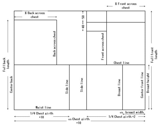 There are various methods of flat cutting to obtain womens’ block pattern. However, these methods can be different and mostly depend on the country or the designers who developed the method. Besides, even within the same country, there is a possibility of having different methods depending on the fashion school and the teachers. Despite this diversity of design techniques, which depend on the perception of pattern, the transition from 3D to 2D is generally referred to as flattening. However, the results of the different technique remain relatively close; all of the techniques follow a common strategy which involves draping a canvas over the women’s body as close as possible. These methods usually start from a basic rectangle whose horizontal direction represents the greatest morphological contour of the body and whose vertical direction represents the greatest height, as shown in Figure 1 (full anterior length is ½ chest circumference +10).