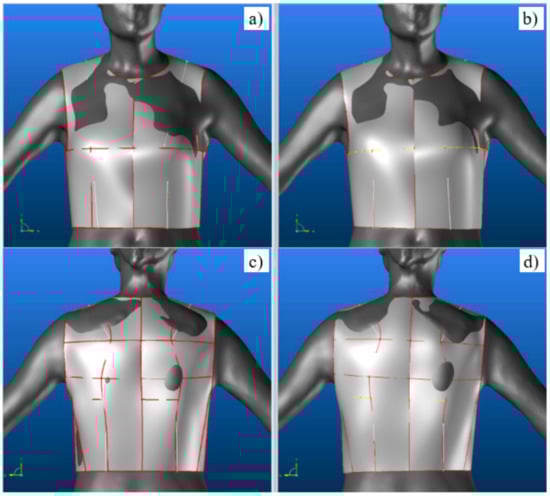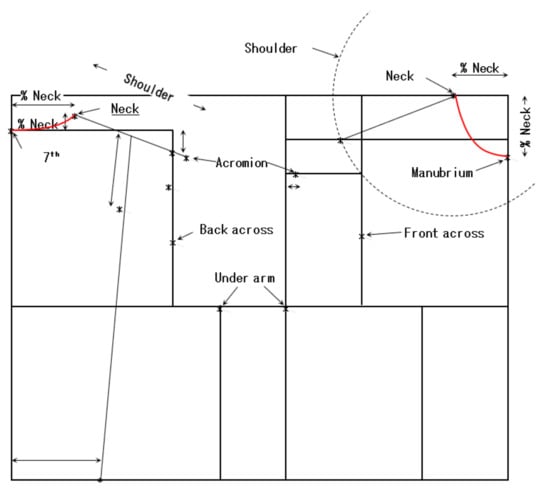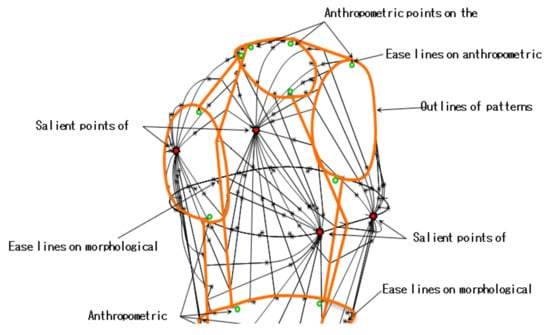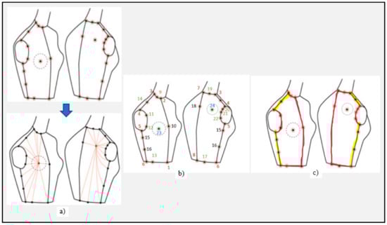 - The establishment of distribution points (red star points) between the protruding points of the chest and scapula, between the anthropometric points of the shoulder line and the sideline (Figure 6a,e);