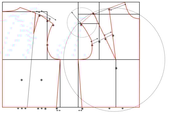 - The positioning of strategic points on the lines and contours (red star points) defining the limits of the garment block pattern (Figure 6a,e);