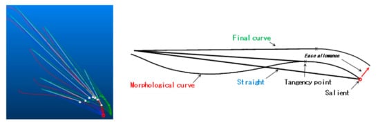 - The creation of straight/curved lines (curved red lines) between the salient points and the contour points of the garment block pattern (Figure 6b,f);